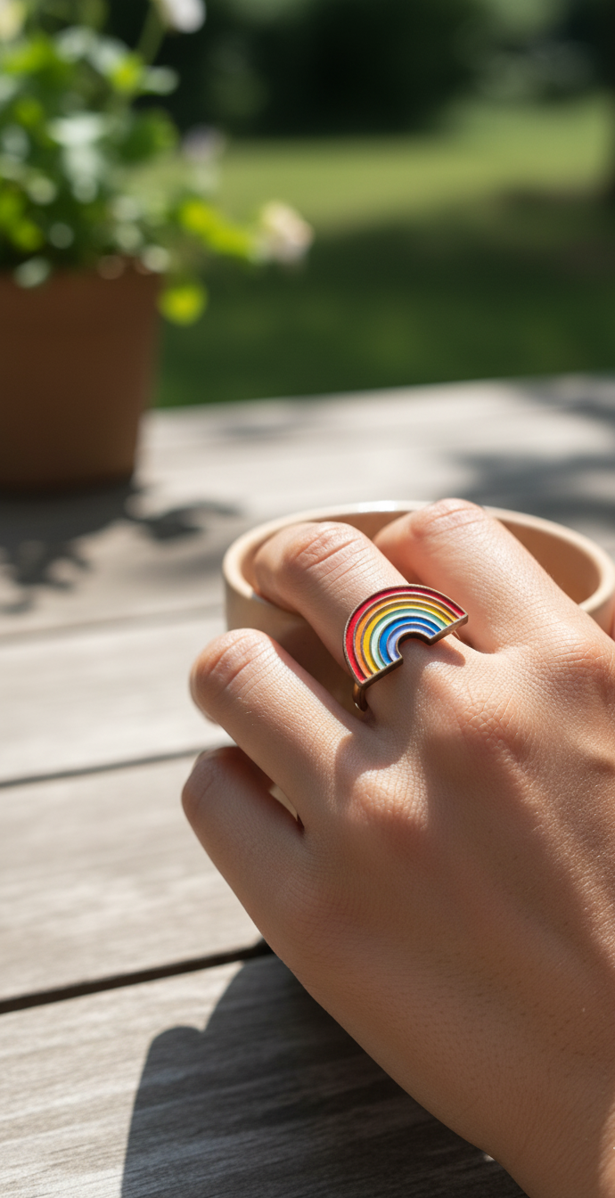 ¡Lleva el sol contigo! Este encantador anillo con baño de oro y esmalte multicolor es la pieza perfecta para añadir un toque de color, positividad y estilo casual-chic a tu día. Ideal para tu look diario.