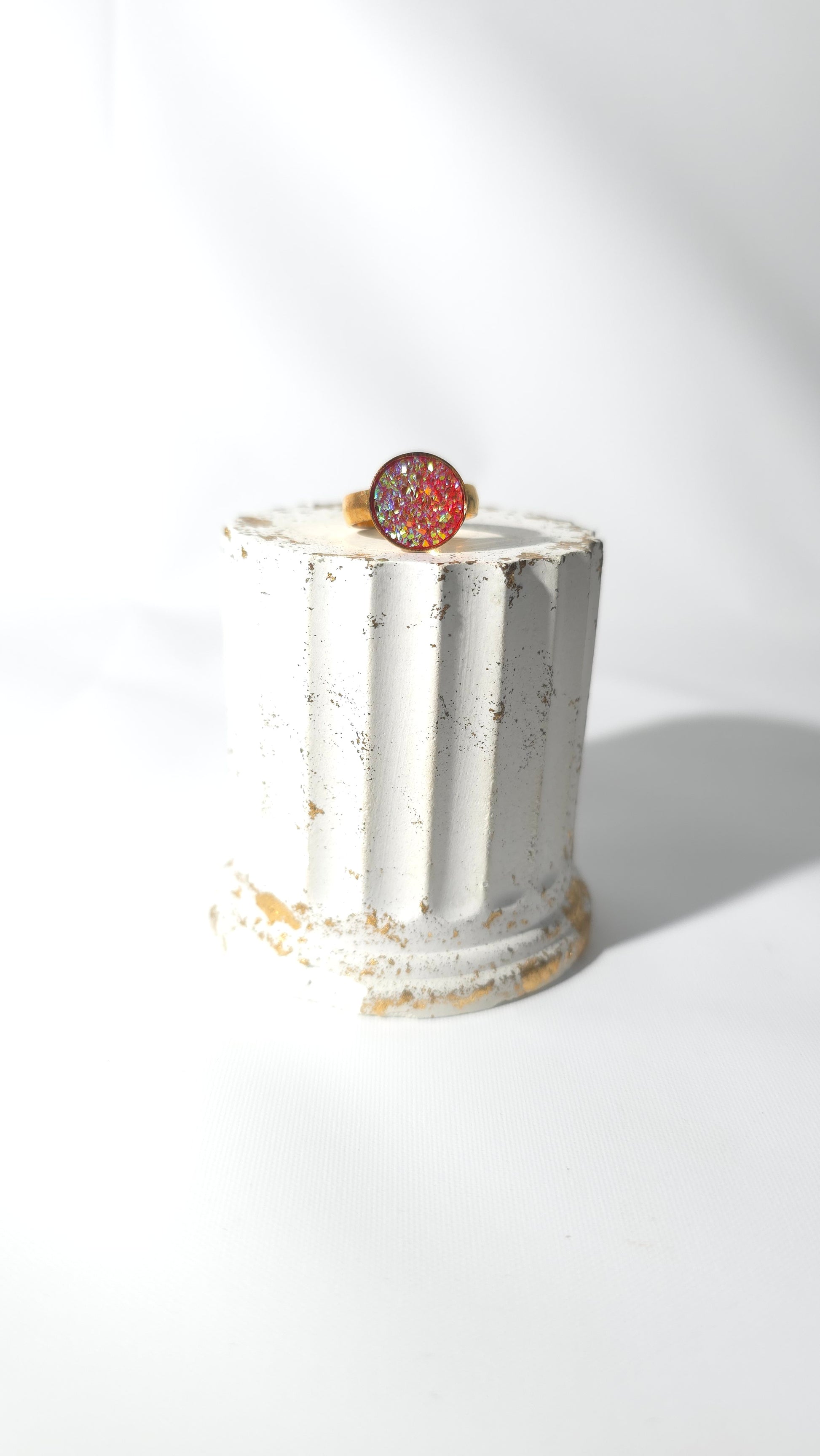 Captura todas las miradas con nuestro Anillo "Aura de Color". Esta pieza exquisita combina un elegante baño de oro que garantiza durabilidad y un brillo sofisticado, con una piedra brusa adornada por un vibrante mosaico de colores.