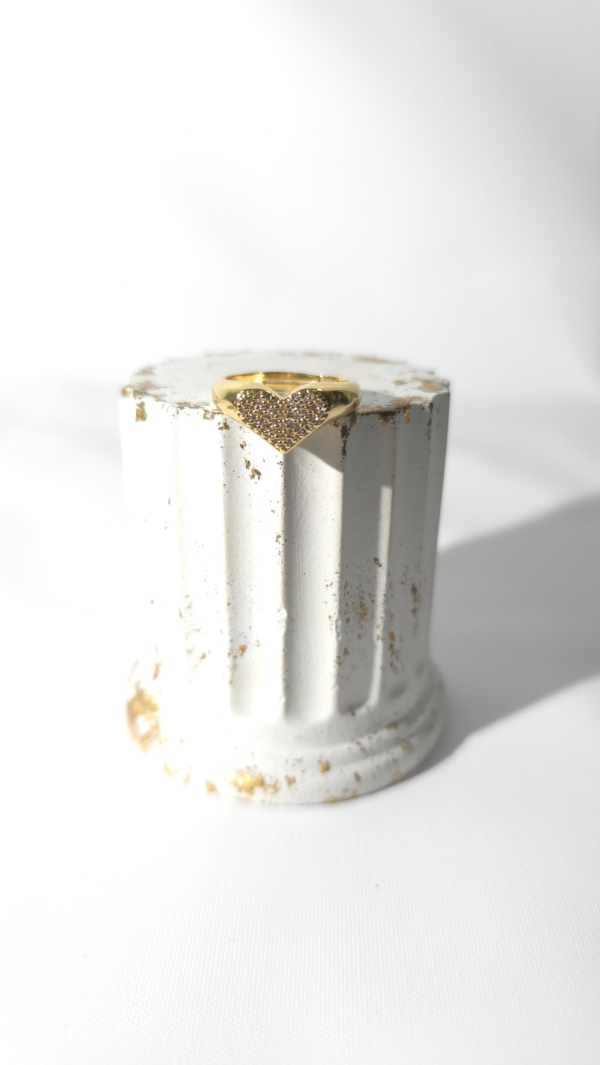 Lujo y Brillo Natural: Este exquisito anillo con baño de oro captura la luz a la perfección, destacando por su diseño de corazón abstracto completamente cubierto de brillantes circonitas.