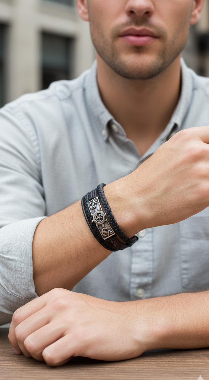 Con un diseño multicapa que combina tiras de cuero liso y trenzado en un profundo color negro, esta pulsera presenta un atractivo adorno metálico que simboliza el viaje: un timón central flanqueado por dos anclas.