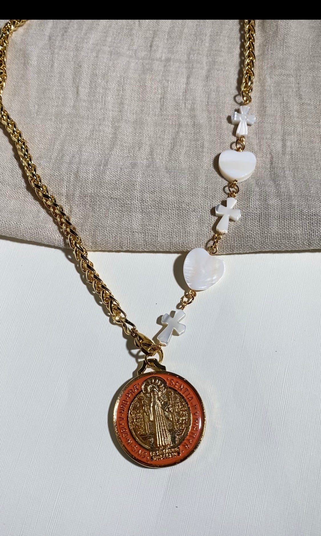 Este elegante collar entorchado combina simbolismo y estilo en una pieza única. Con un diseño de delicadas cruces y corazones entrelazados, destaca en el centro la poderosa medalla de San Benito, símbolo de protección y fe. Su vibrante tono naranja aporta calidez y energía, mientras que el baño de oro de 24 quilates le da un acabado sofisticado y duradero. Ideal para llevar contigo una conexión espiritual con un toque moderno y refinado