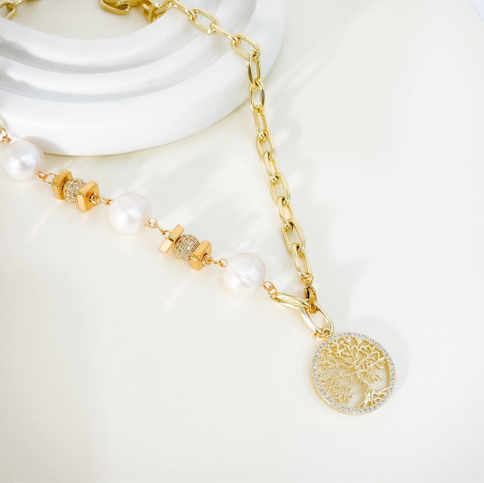 Elegancia instantánea en un solo accesorio. Nuestro collar grueso bañado en oro de 24 quilates está compuesto por un cadena gruesa con detalles en perlas 100% naturales, listas para usar sin enredos ni combinaciones difíciles. Ideal para quienes buscan un look moderno, equilibrado y lleno de brillo.