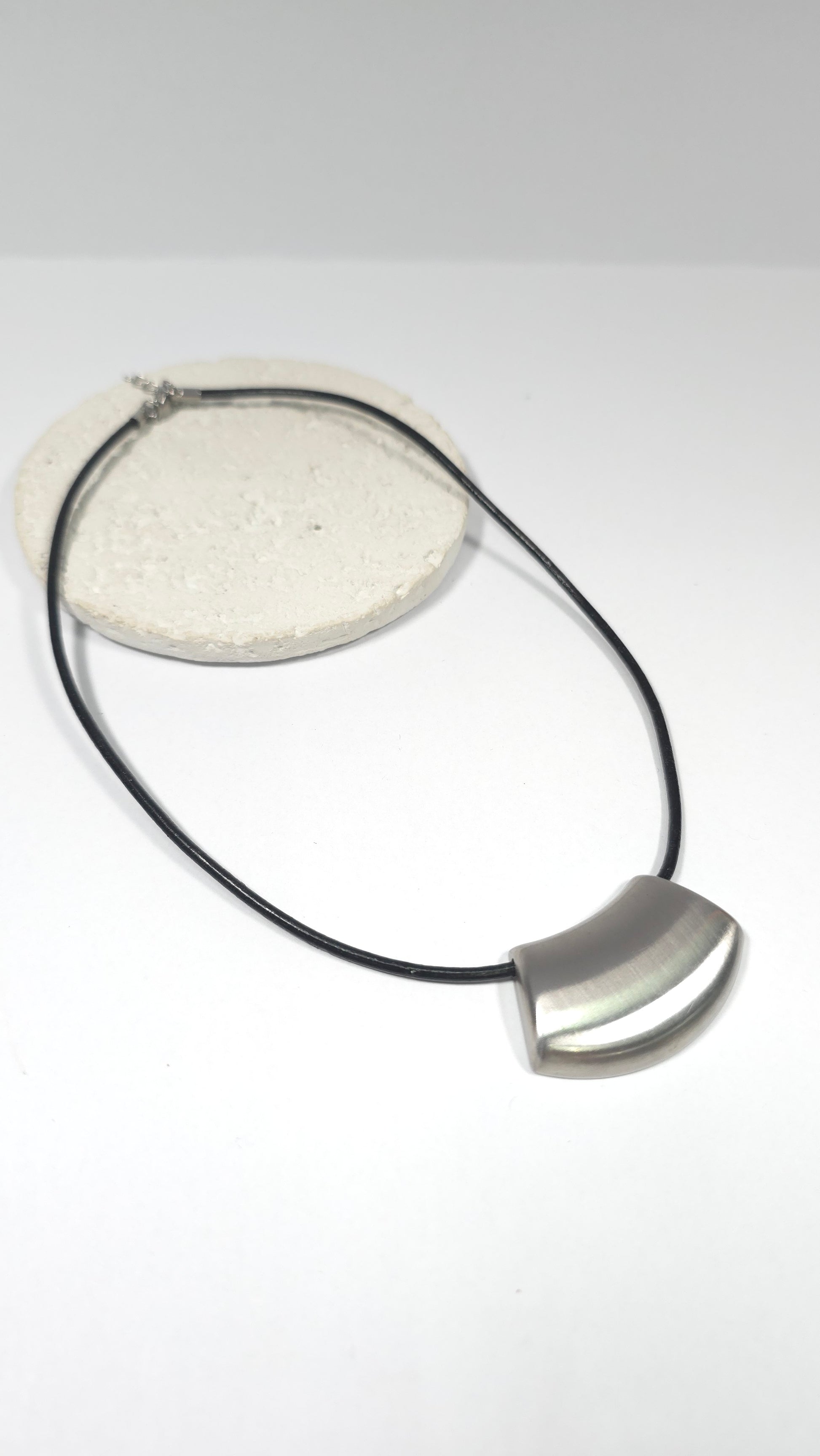 Collar Minimalista Curvo en Rodio y Cuero Liso.