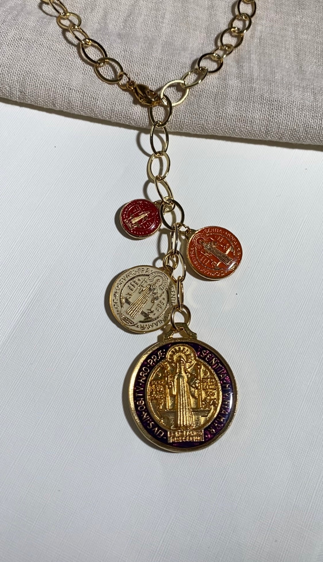 Un diseño que no pasa desapercibido! Este collar mezcla varias medallas de San Benito en colores vibrantes con una cadena dorada súper moderna.
