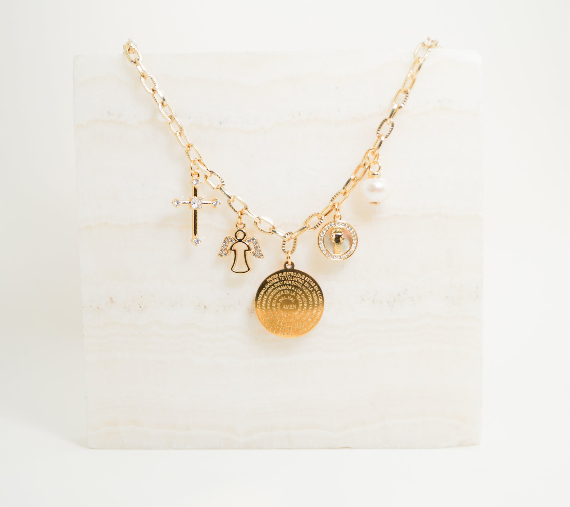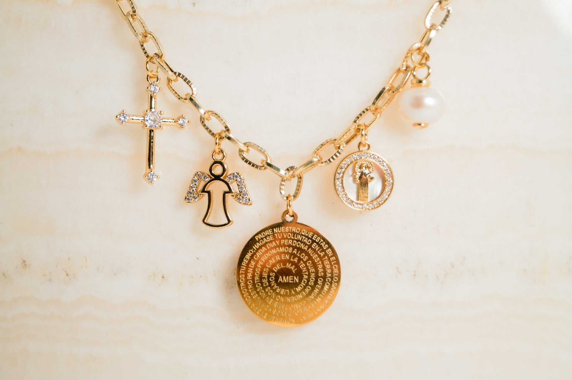 Collar con dije en baño de oro de 24 quilates y oración del padre nuestro grabada, complementado con dijes de ángeles y perlas que resaltan la belleza de este collar.