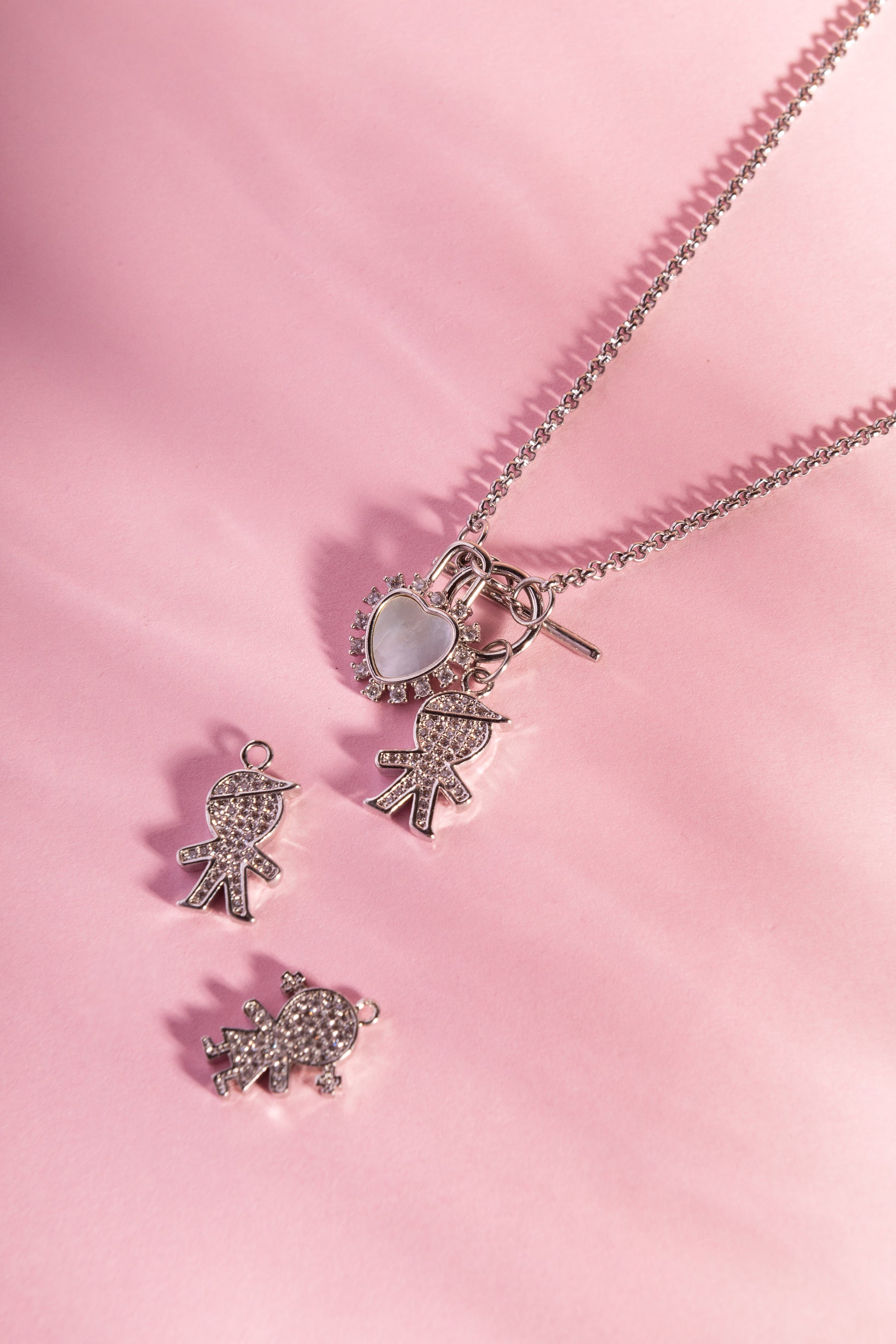 Este delicado collar plateado captura el amor eterno de una madre. Con dijes en forma de niños finamente detallados, cada figura representa a un hijo o hija, simbolizando la conexión única y profunda entre madre e hijos. Elaborado en plata de ley, su brillo sutil y diseño personalizado lo convierten en una joya significativa, ideal para llevar siempre cerca a quienes más amas.