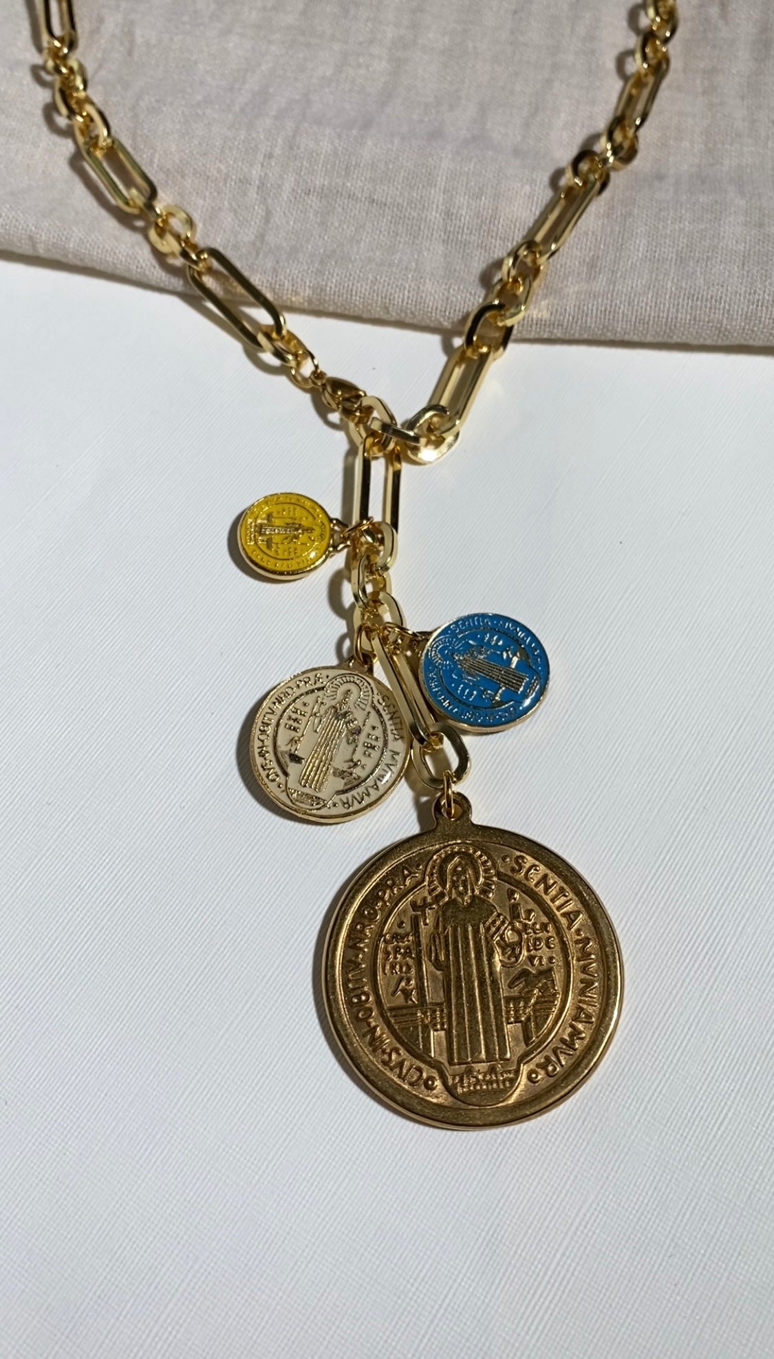 Este impactante collar destaca por su medalla central grande de San Benito, símbolo de protección, fe y fuerza espiritual.