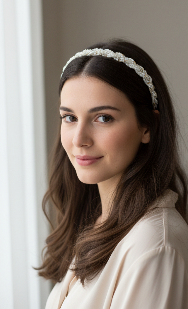 Hecha a mano con delicadas perlas y cristales brillantes, esta diadema aporta una sutil luminosidad que complementa cualquier peinado, ya sea suelto, ondulado o recogido. Su diseño es ligero y cómodo, permitiéndote lucir deslumbrante sin esfuerzo. Ideal para novias, damas de honor o invitadas que buscan un detalle sofisticado y romántico