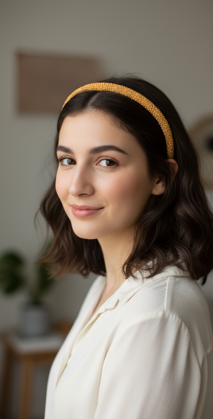Esta elegante diadema rígida está completamente cubierta a mano con miles de micro-cuentas de un vibrante tono amarillo mostaza/naranja pálido, creando una textura rica y brillante. Su diseño es perfecto para realzar un peinado casual o complementar un atuendo festivo.