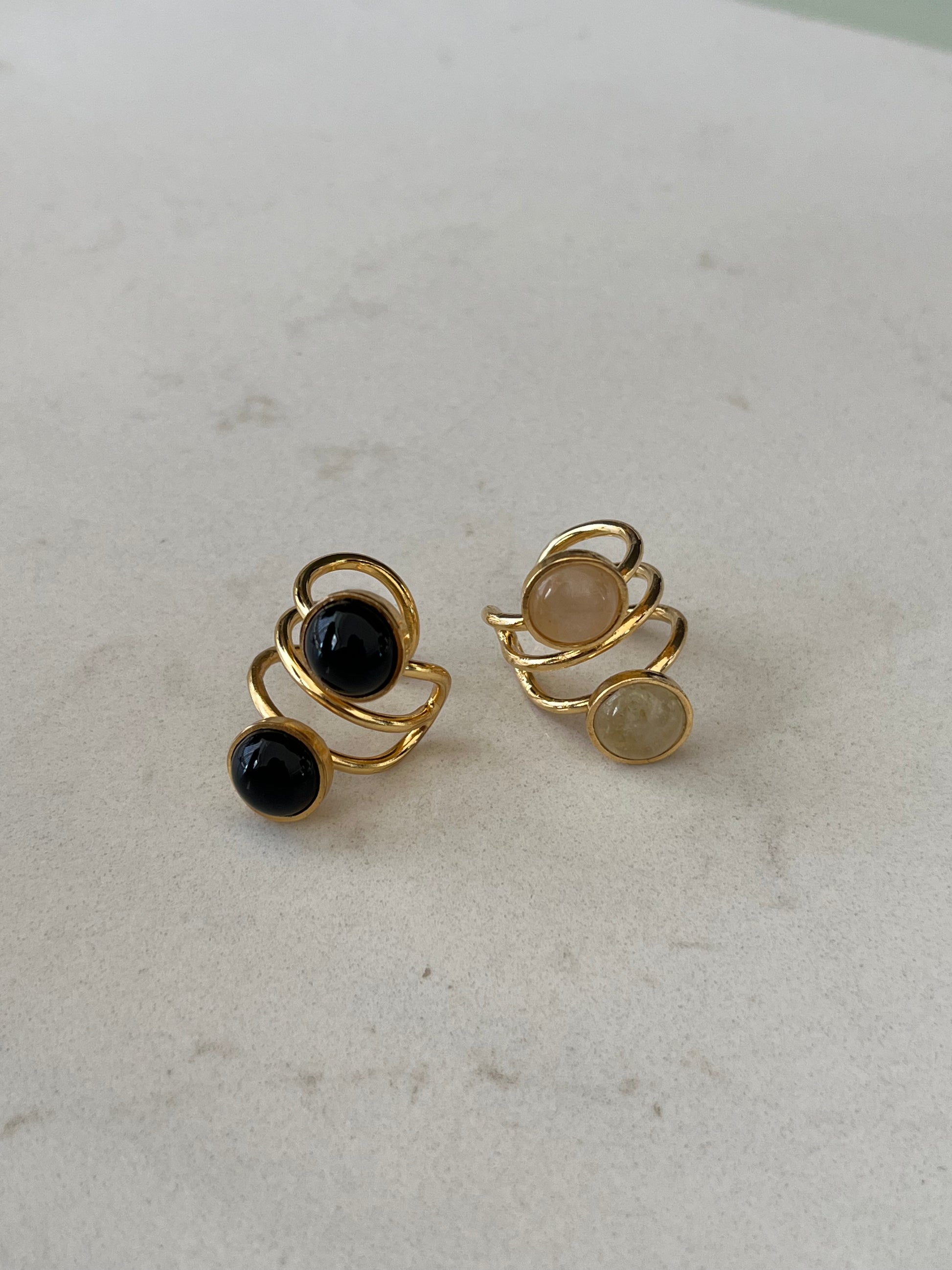 Los Earcuff Dobles con Cuarzo y Detalles en Baño de Oro 24K de Toque Celestial combinan elegancia, modernidad y un toque de contraste único. Diseñados con dos piedras de cuarzo —un intenso negro y un delicado rosado transparente—, estos earcuffs ofrecen una mezcla de tonos que equilibra sofisticación y suavidad en cada look.