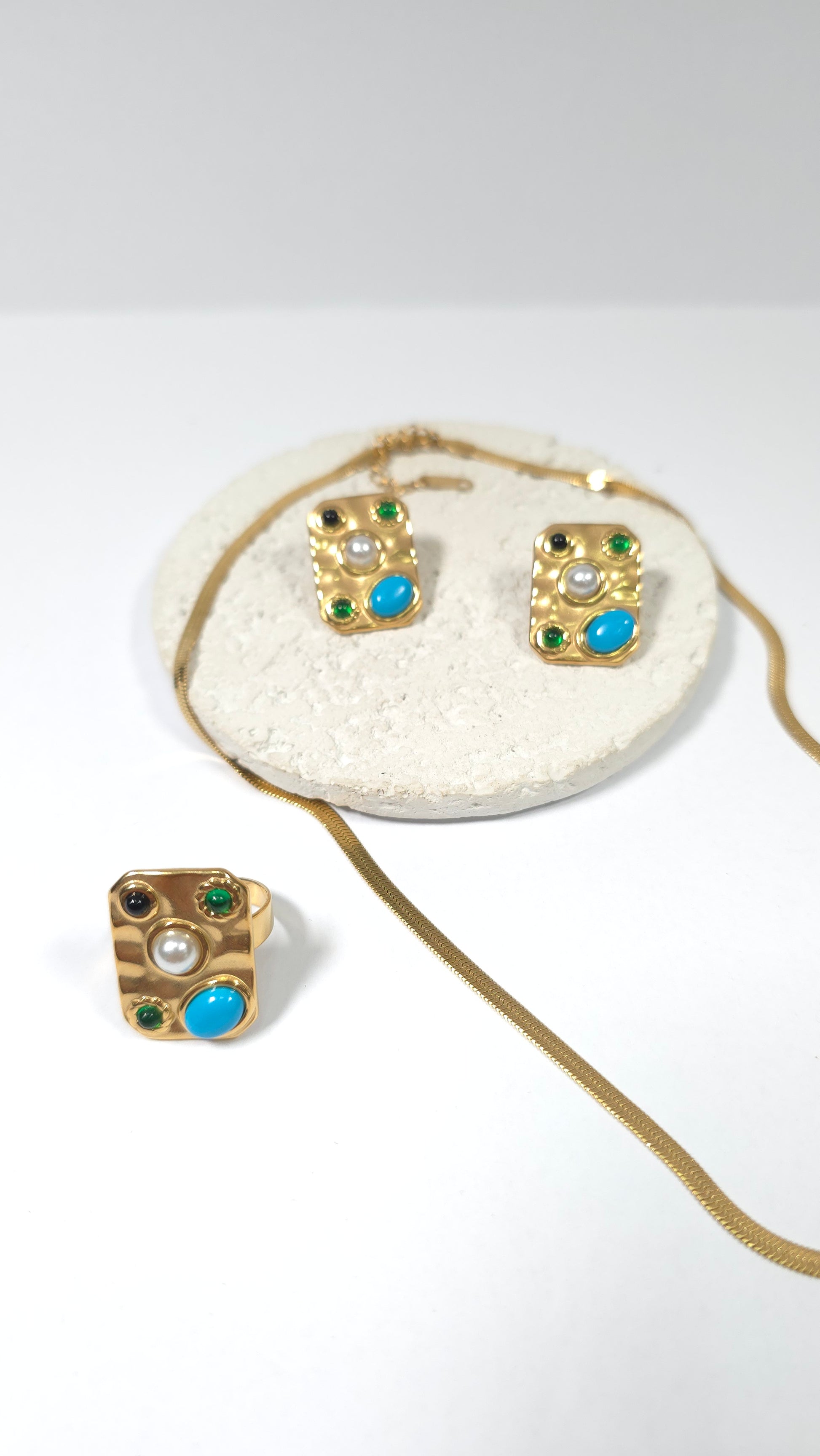 El collar cuenta con una delicada cadena dorada que complementa a la perfección el colgante principal, ideal para lucir con cualquier escote. Los aretes a juego repiten el diseño rectangular, enmarcando tu rostro con un brillo sutil pero impactante. Para completar el conjunto, el anillo es una pieza audaz y elegante que se convertirá en el centro de atención de tu mano.
