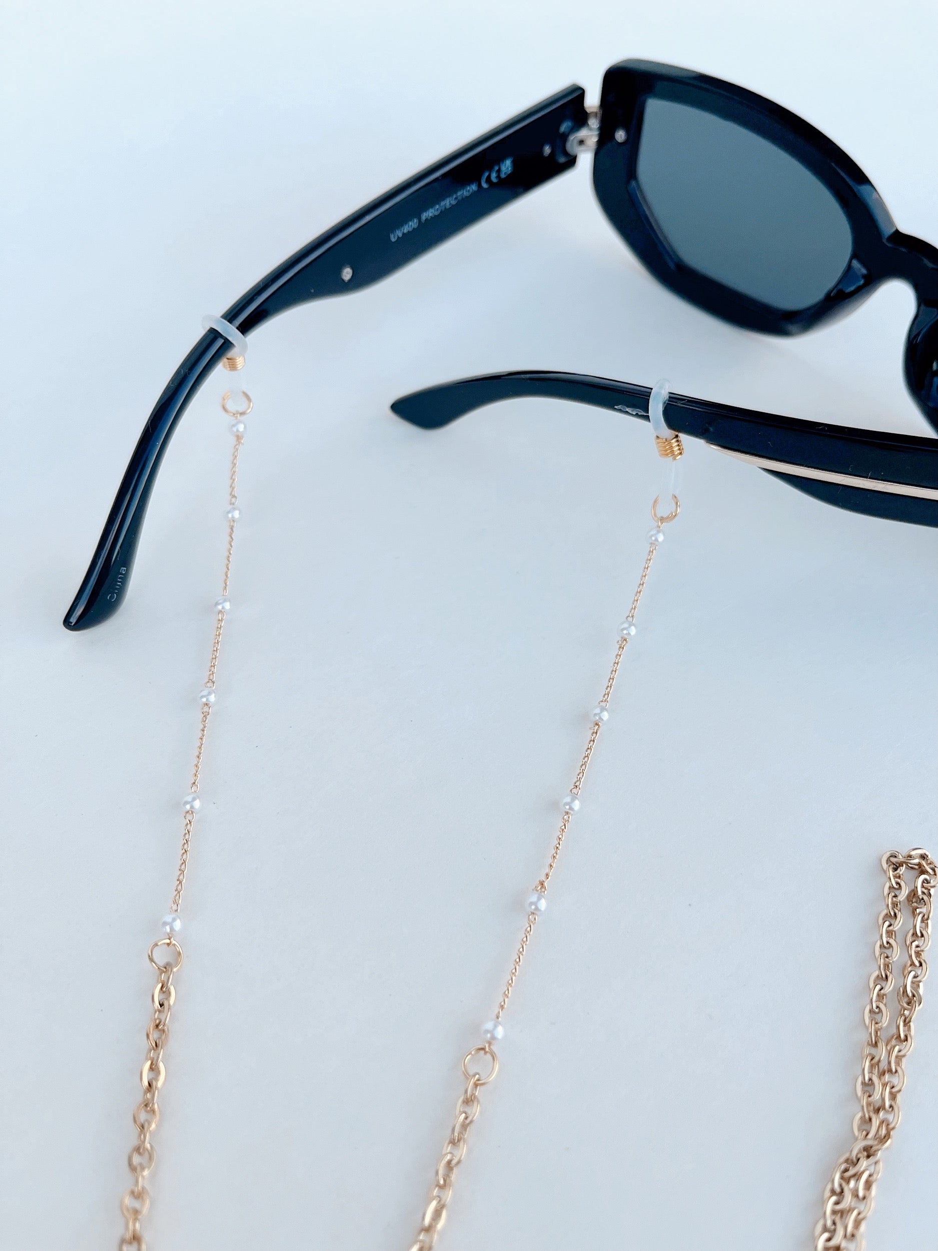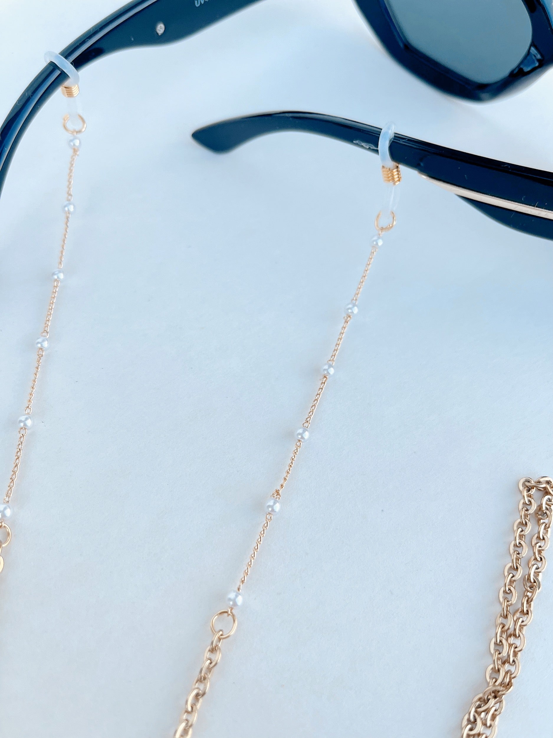Cadena de lentes hecha a mano con diferentes abalorios y detalles en baño de oro.