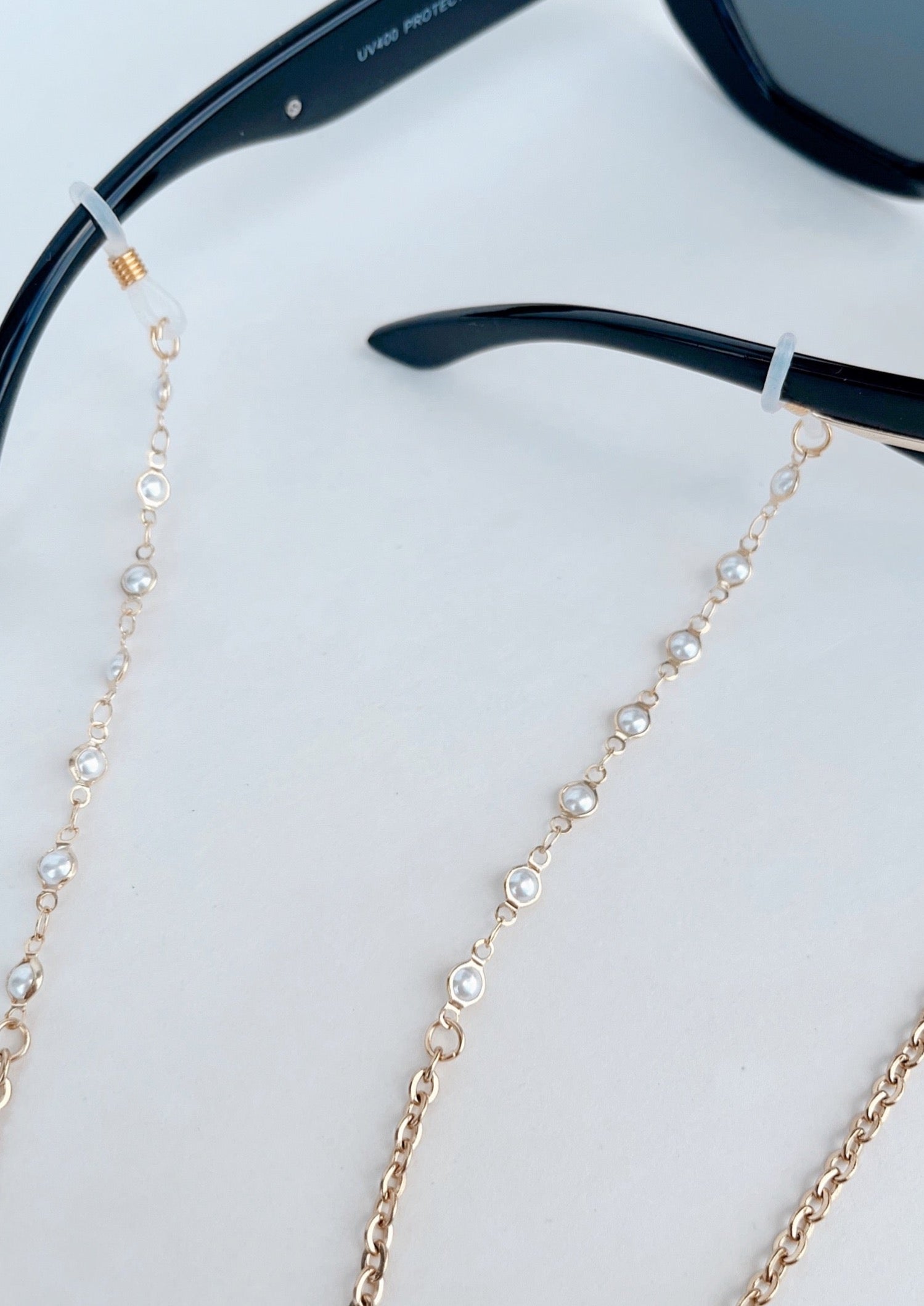 Cadena de lentes hecha a mano detalles en baño de oro y perlas.