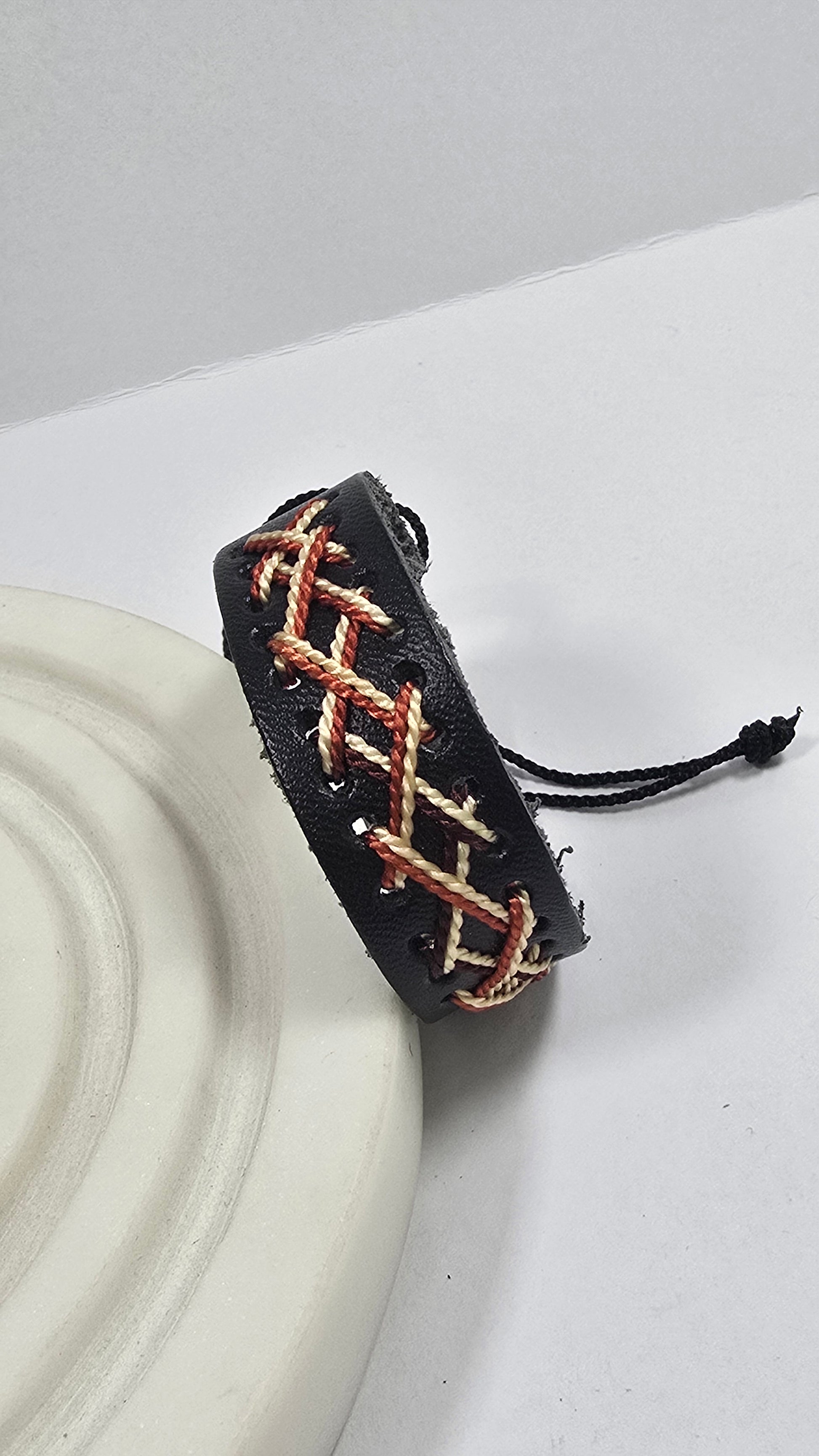 Añade un toque de estilo rústico y sofisticado a tu look diario con este brazalete de cuero negro. Presenta un llamativo tejido cruzado central en tonos tierra (marrón y beige/crema) que le da un carácter único y artesanal. Es el accesorio perfecto para el hombre moderno que valora la simplicidad y el diseño distintivo. Su cierre de cordón ajustable garantiza un ajuste cómodo y seguro para cualquier tamaño de muñeca.