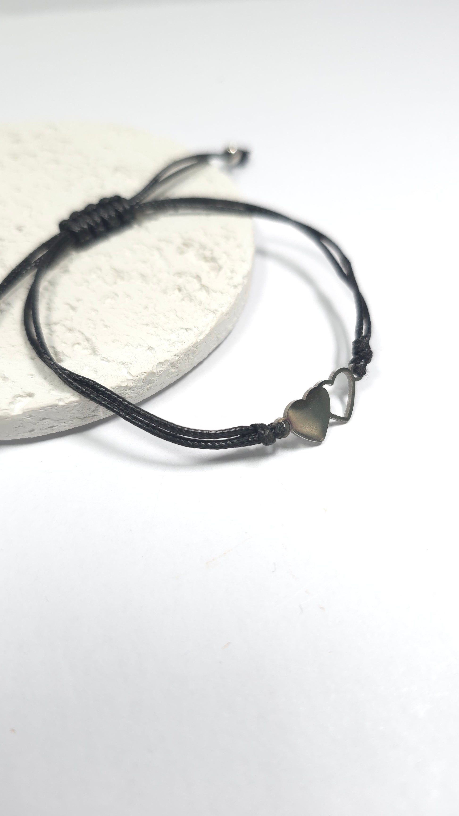 El regalo perfecto para tu media naranja o mejor amiga. Esta pulsera de cordón negro resalta por su hermoso dije de dos corazones entrelazados, representando el amor o la amistad duradera. Su sistema de nudo corredizo asegura un ajuste cómodo para cualquier muñeca. Es un detalle sutil y significativo que nunca pasa de moda.