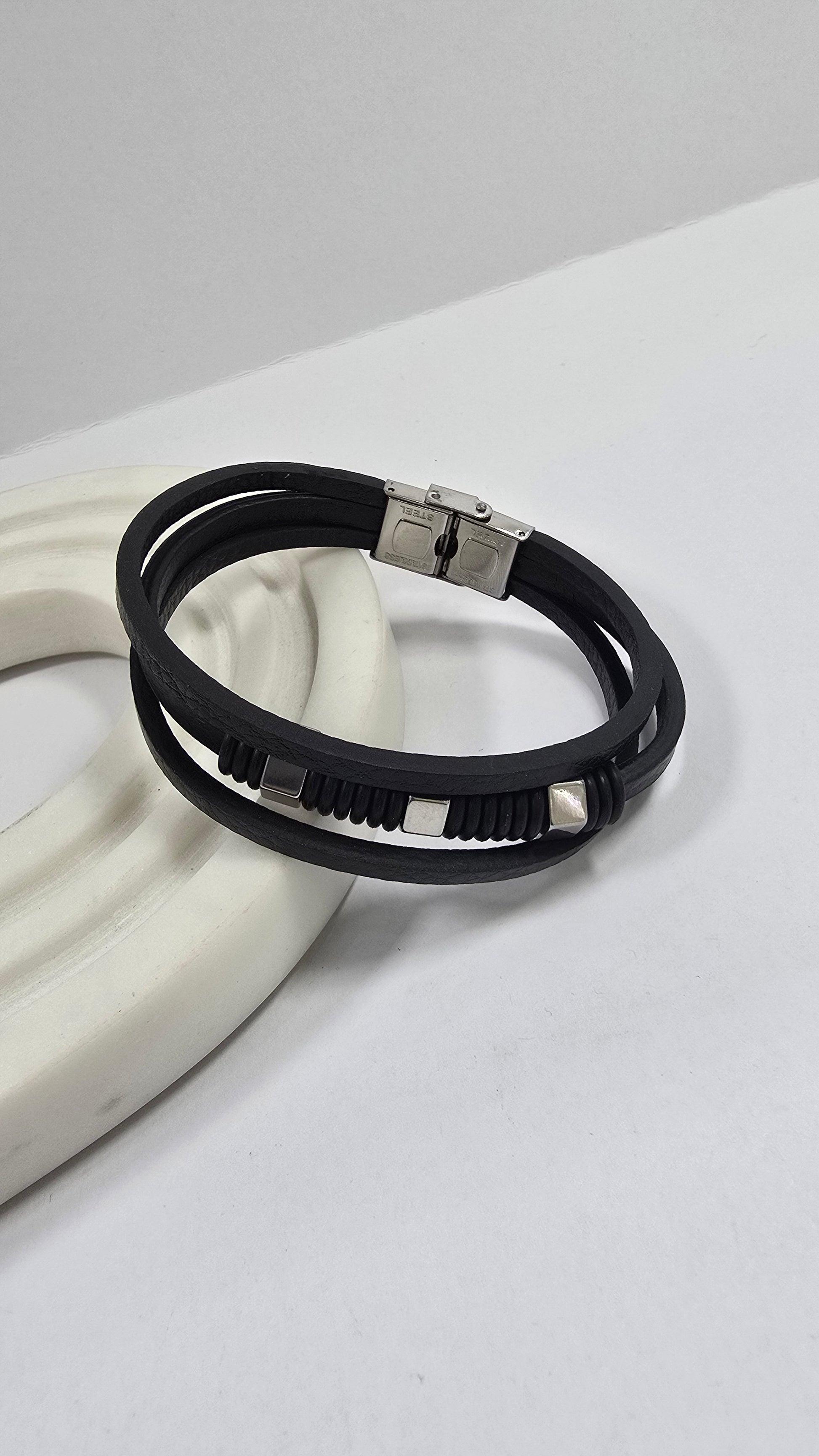 Estilo minimalista y robusto para el hombre moderno. Esta pulsera combina tiras de cuero negro genuino y trenzado con elegantes acentos de metal plateado. Su diseño multicapa ofrece una apariencia audaz pero refinada. El cierre de acero inoxidable garantiza seguridad y durabilidad. Perfecta para el uso diario, eleva cualquier atuendo casual o semi-formal. Un accesorio esencial que define tu estilo.