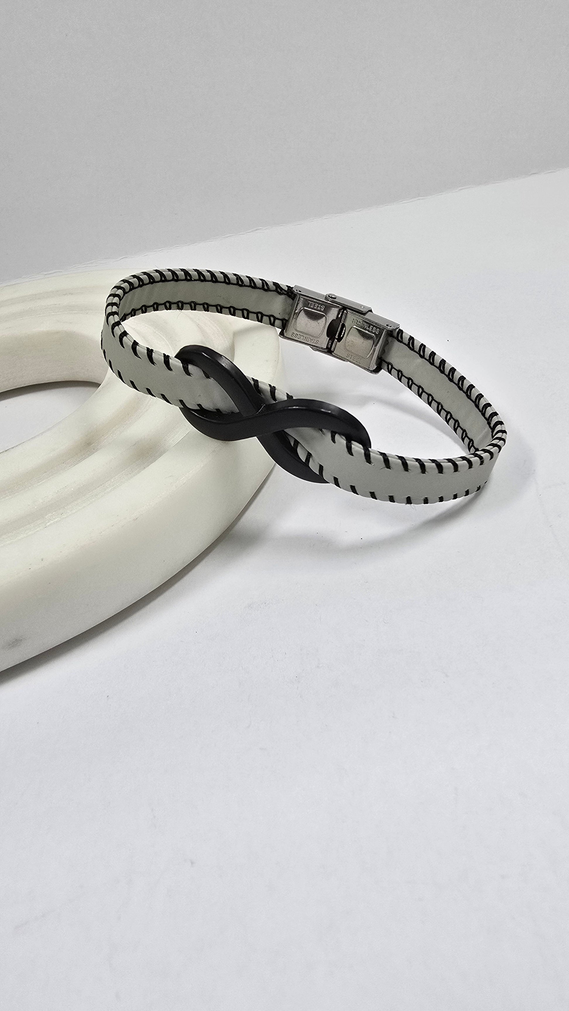 Un accesorio con estilo y significado, ideal para el hombre moderno. Esta pulsera presenta un diseño audaz de contraste: una banda elegante de color blanco/gris con costuras negras que enmarca un impactante símbolo del Infinito central en acabado negro mate.