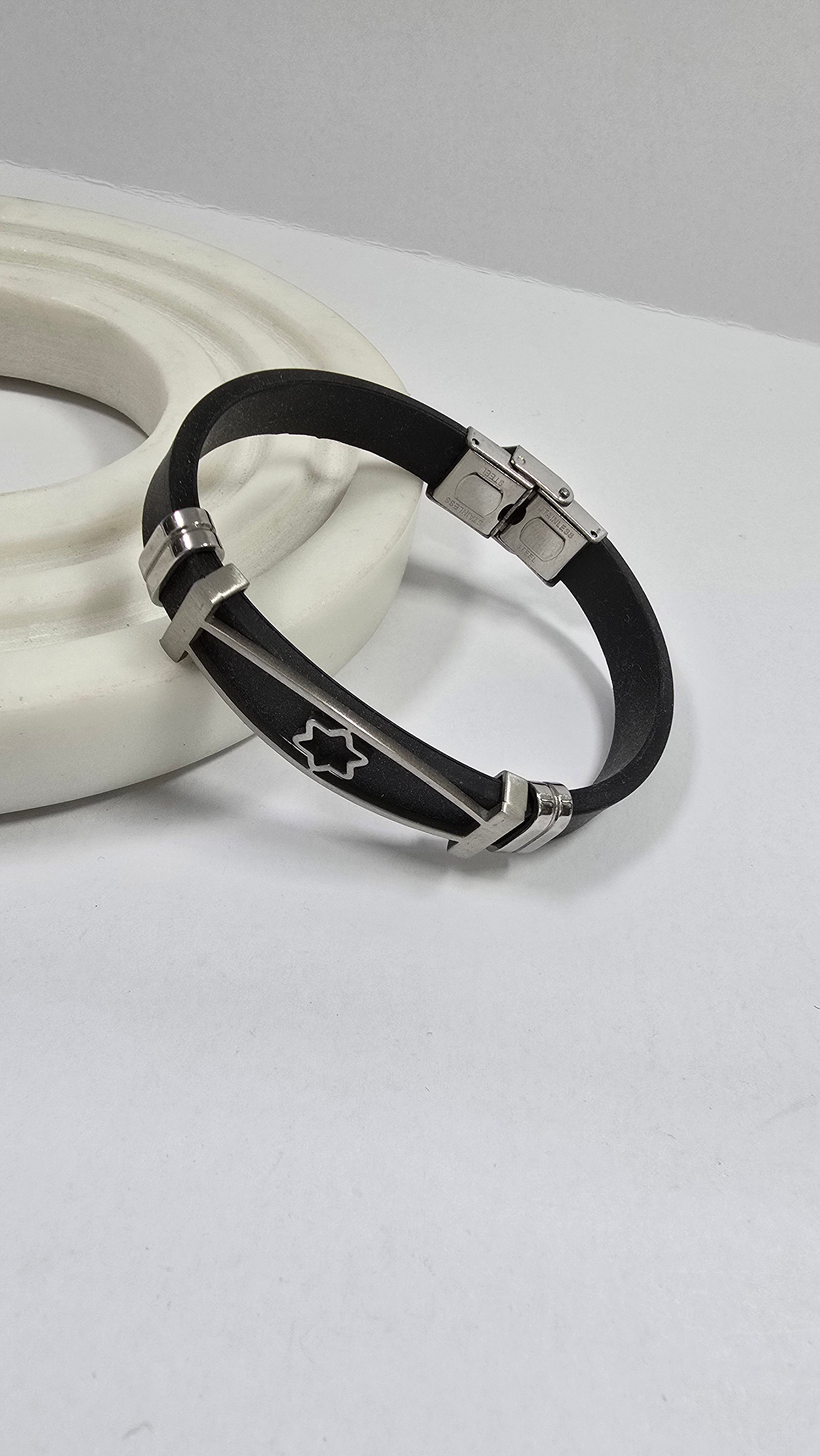 Esta pulsera combina la fuerza del caucho negro con la elegancia duradera del acero inoxidable. Su diseño minimalista y moderno es perfecto para el hombre que busca un accesorio con estilo y significado.