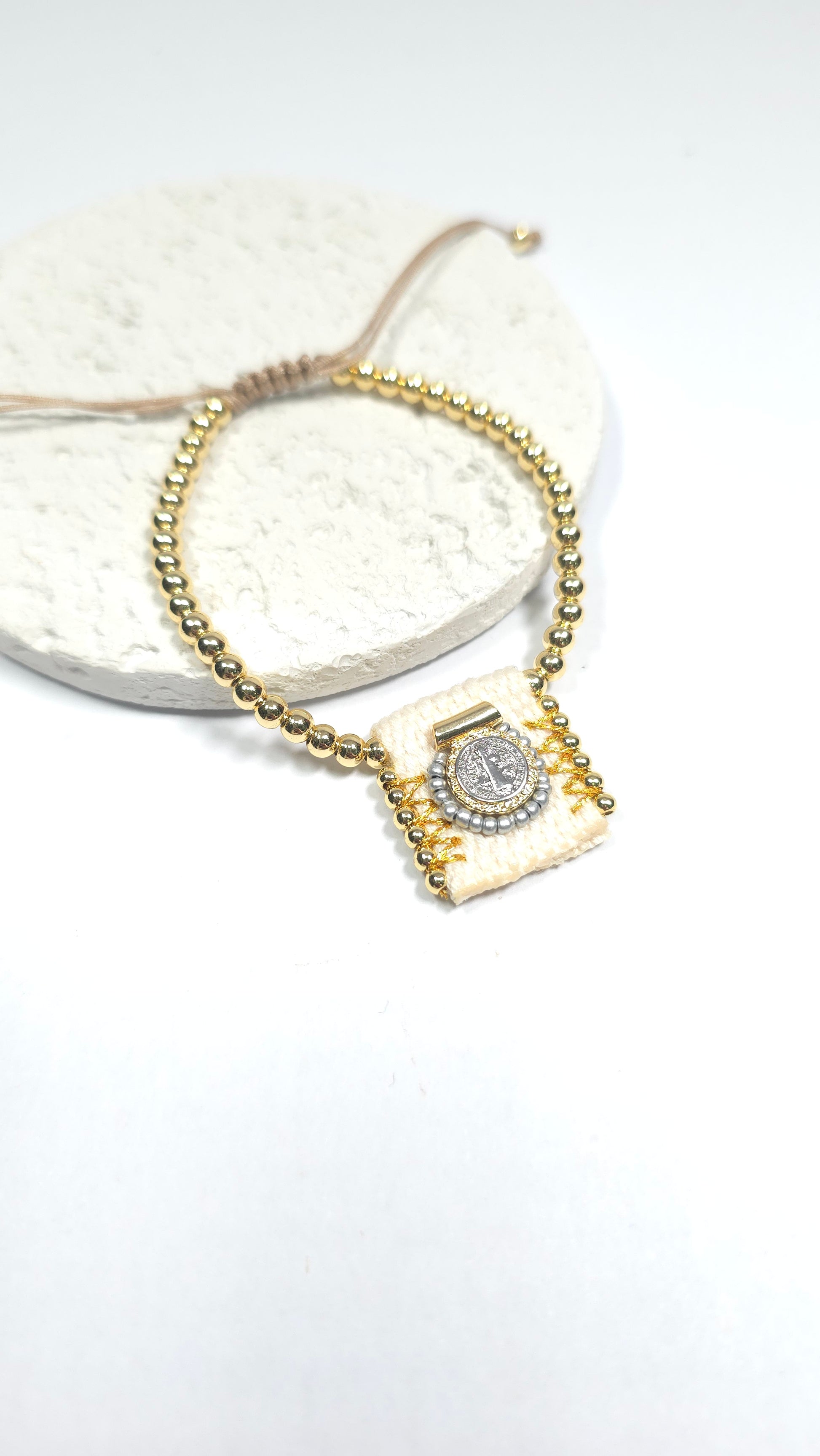 Lleva contigo la protección y la elegancia con nuestra Pulsera, Esta pieza única combina el brillo de las cuentas doradas con un centro tejido a mano en tono neutro, que enmarca la tradicional Medalla de San Benito. Su diseño ajustable asegura un ajuste cómodo y perfecto en tu muñeca. Un accesorio lleno de fe, estilo y significado."
