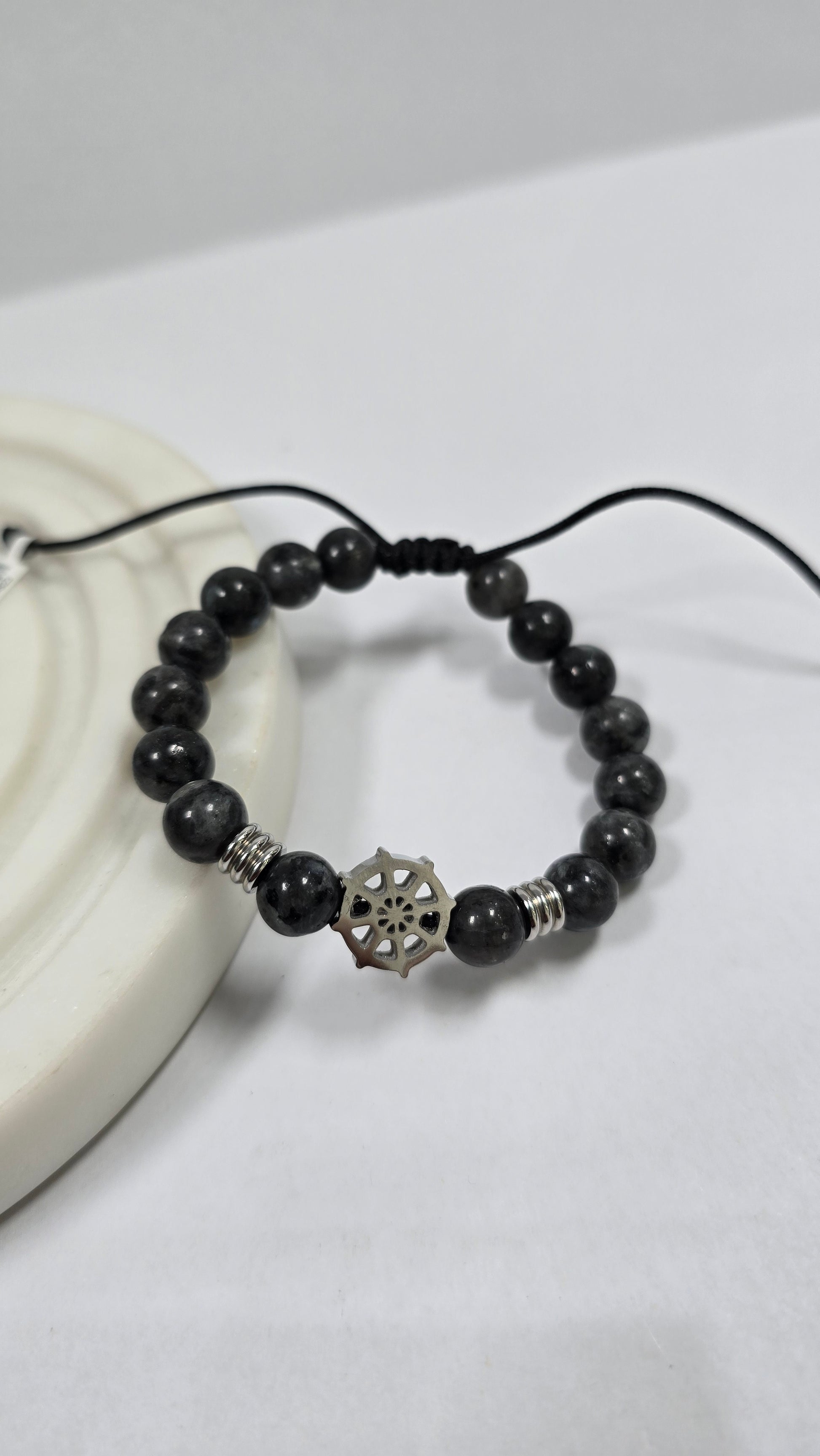 Elaborada con piedras de ónix gris natural pulidas, cada cuenta exhibe un veteado sutil y un acabado mate elegante. El diseño se centra en un dije de acero inoxidable que representa el Dharmachakra o Rueda del Dharma, símbolo de progreso, movimiento y la búsqueda de la perfección espiritual.