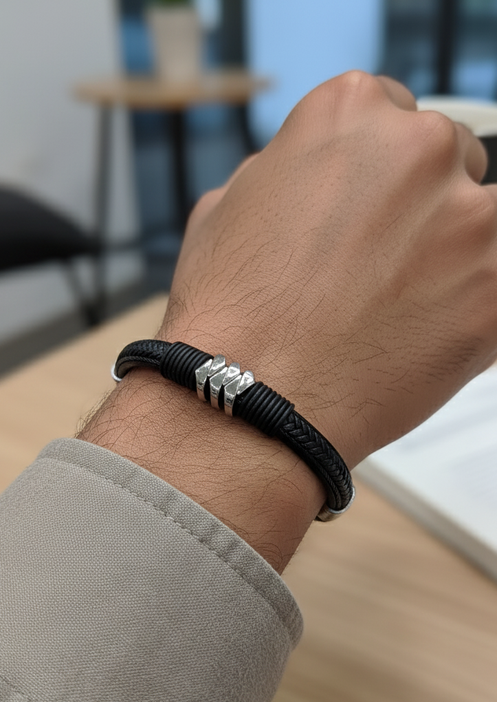 Esta pulsera es el accesorio esencial para el hombre moderno. Confeccionada con cuero trenzado negro de alta calidad, destaca por sus tres dientes de acero pulido que añaden un toque de audacia y carácter. El diseño es robusto pero sofisticado, ideal para llevar tanto en la oficina como en tus salidas casuales. El cierre magnético asegura un ajuste cómodo y seguro. Una pieza atemporal que simboliza fuerza, estilo y determinación.