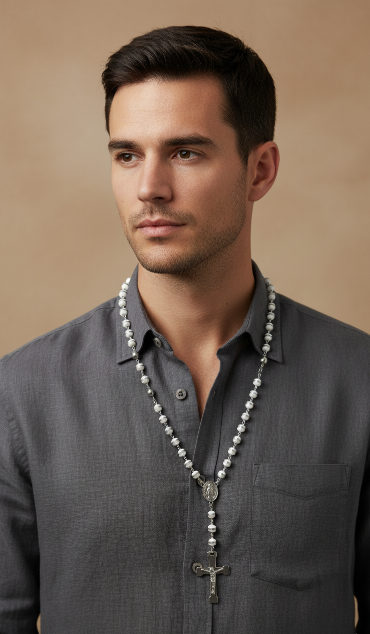 Este rosario es una pieza de profunda devoción, perfecta para el hombre de fe que busca un recordatorio constante de su espiritualidad.