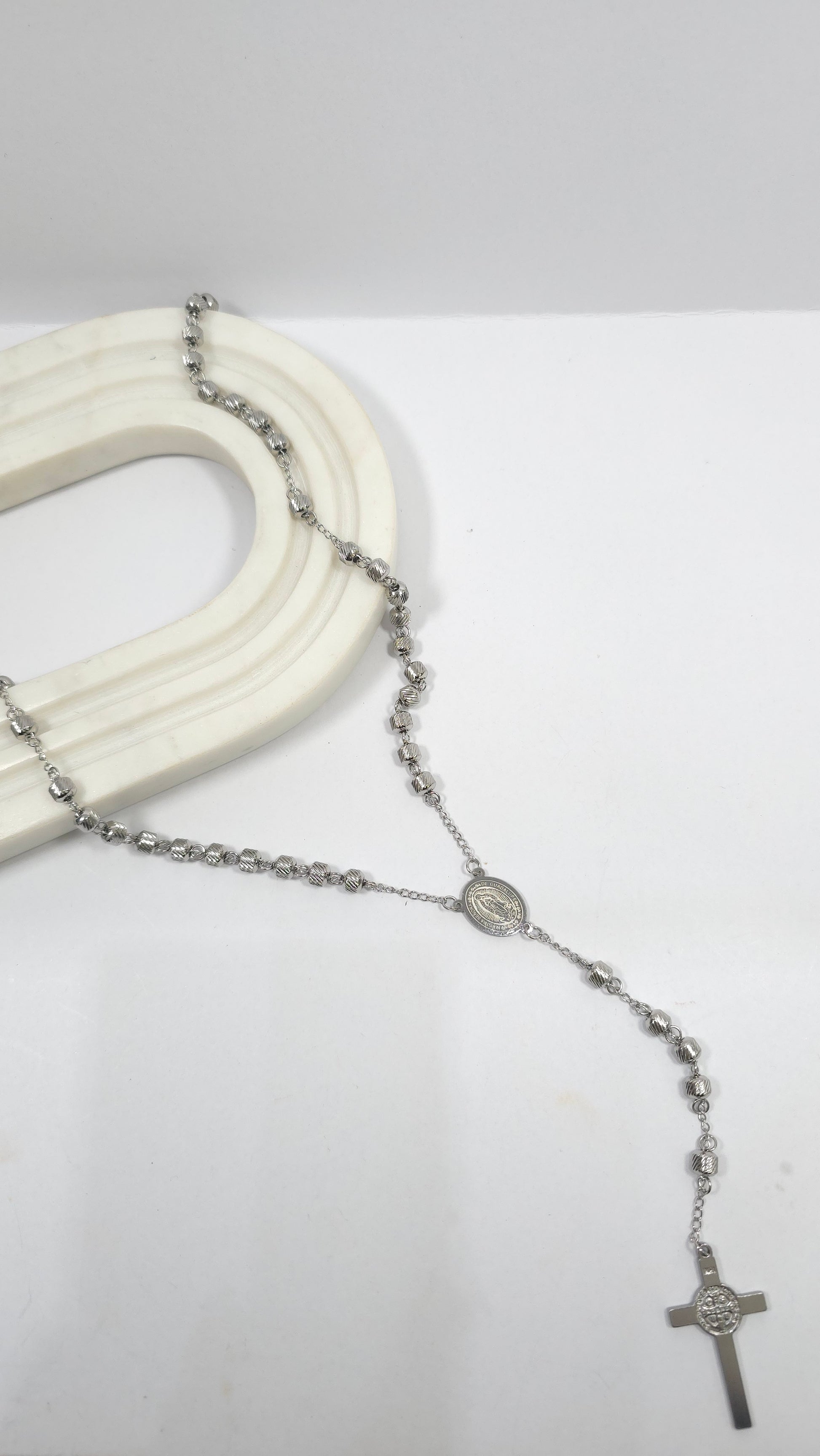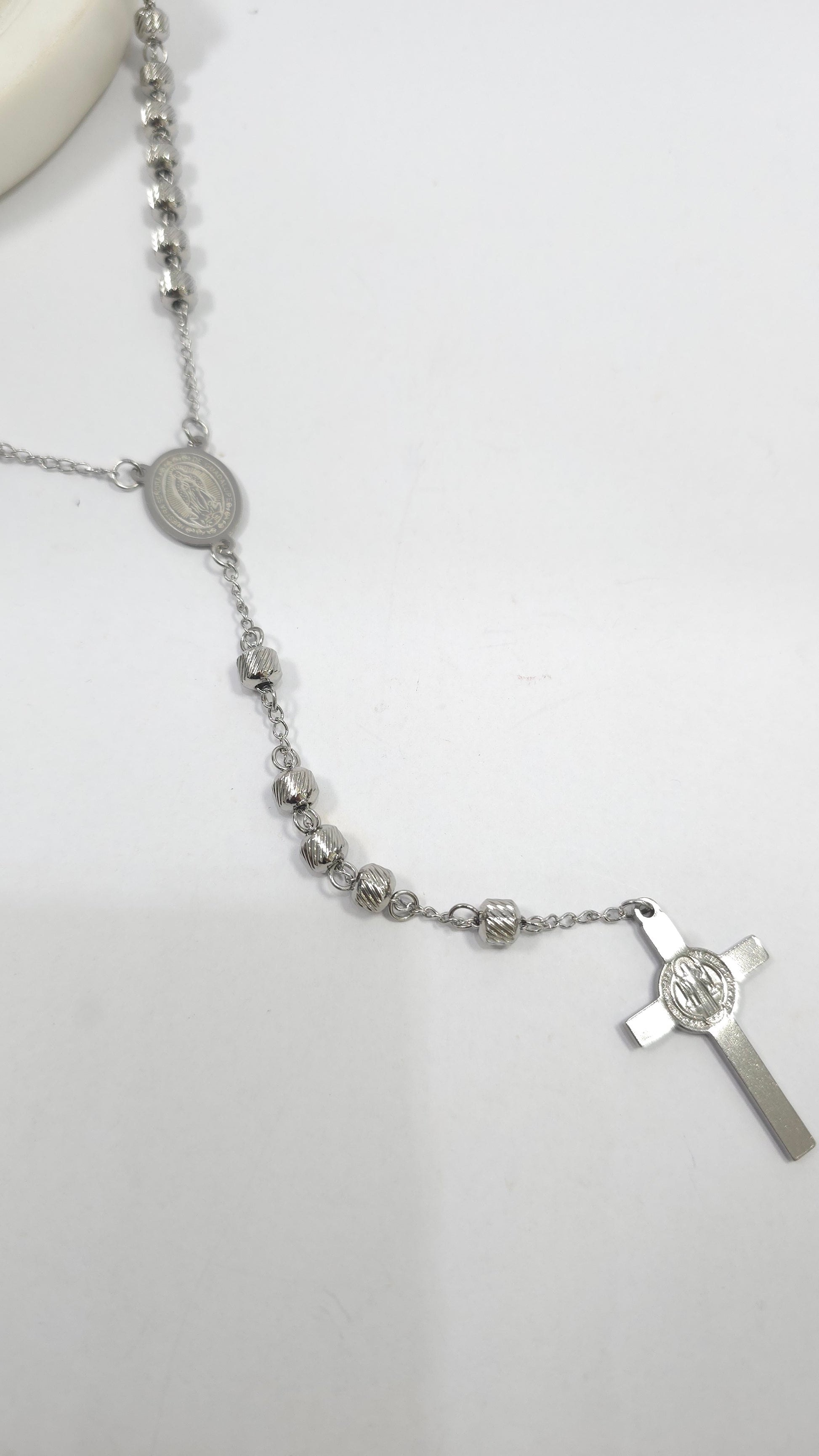 Un rosario diseñado para el hombre moderno que valora la fe y el estilo. Este collar destaca por su Cruz de San Benito (con la medalla integrada), un poderoso símbolo de protección. Las cuentas de acero inoxidable presentan un elegante y único tallado que añade textura y brillo. Fabricado en acero inoxidable de alta calidad, es resistente y duradero, ideal para llevarlo a diario.