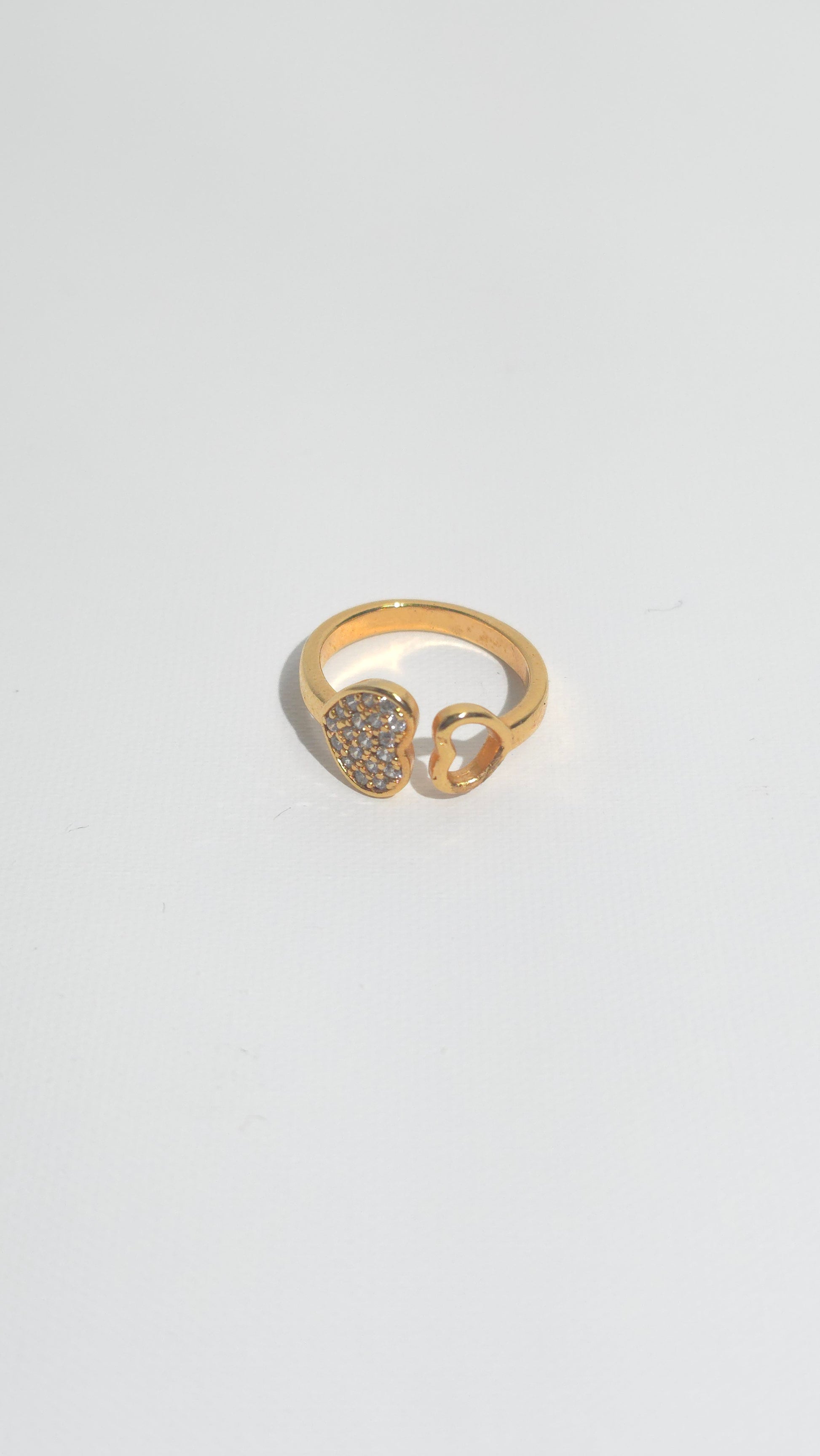 Una promesa de amor y brillo para tu día a día. Este encantador anillo (medio dedo) de diseño abierto está bañado en un hermoso oro y presenta un delicado doble corazón. Un corazón liso y pulido se une a otro engastado con brillantes abalorios, creando un contraste sofisticado. Es la pieza perfecta para añadir un toque de lujo discreto