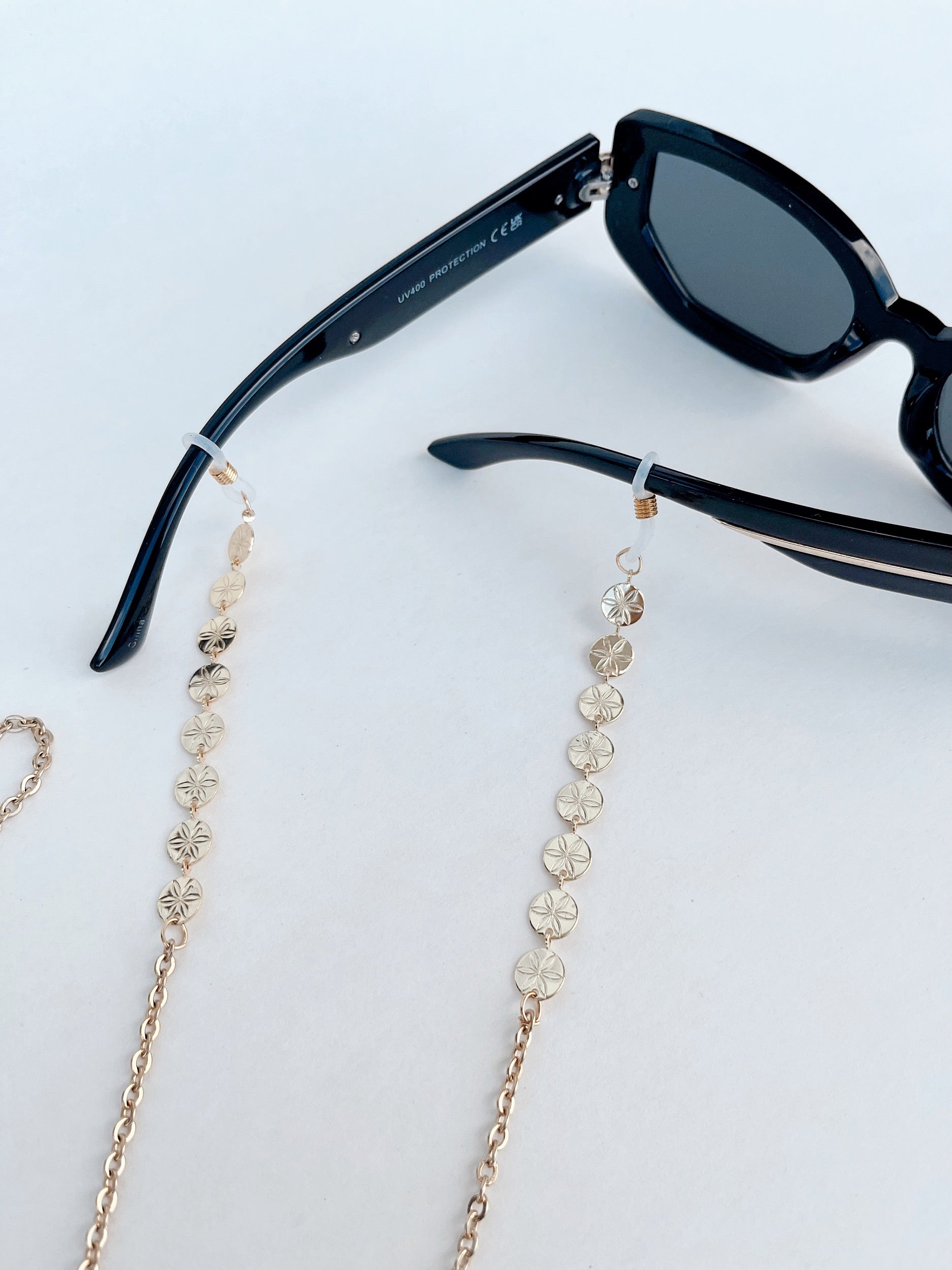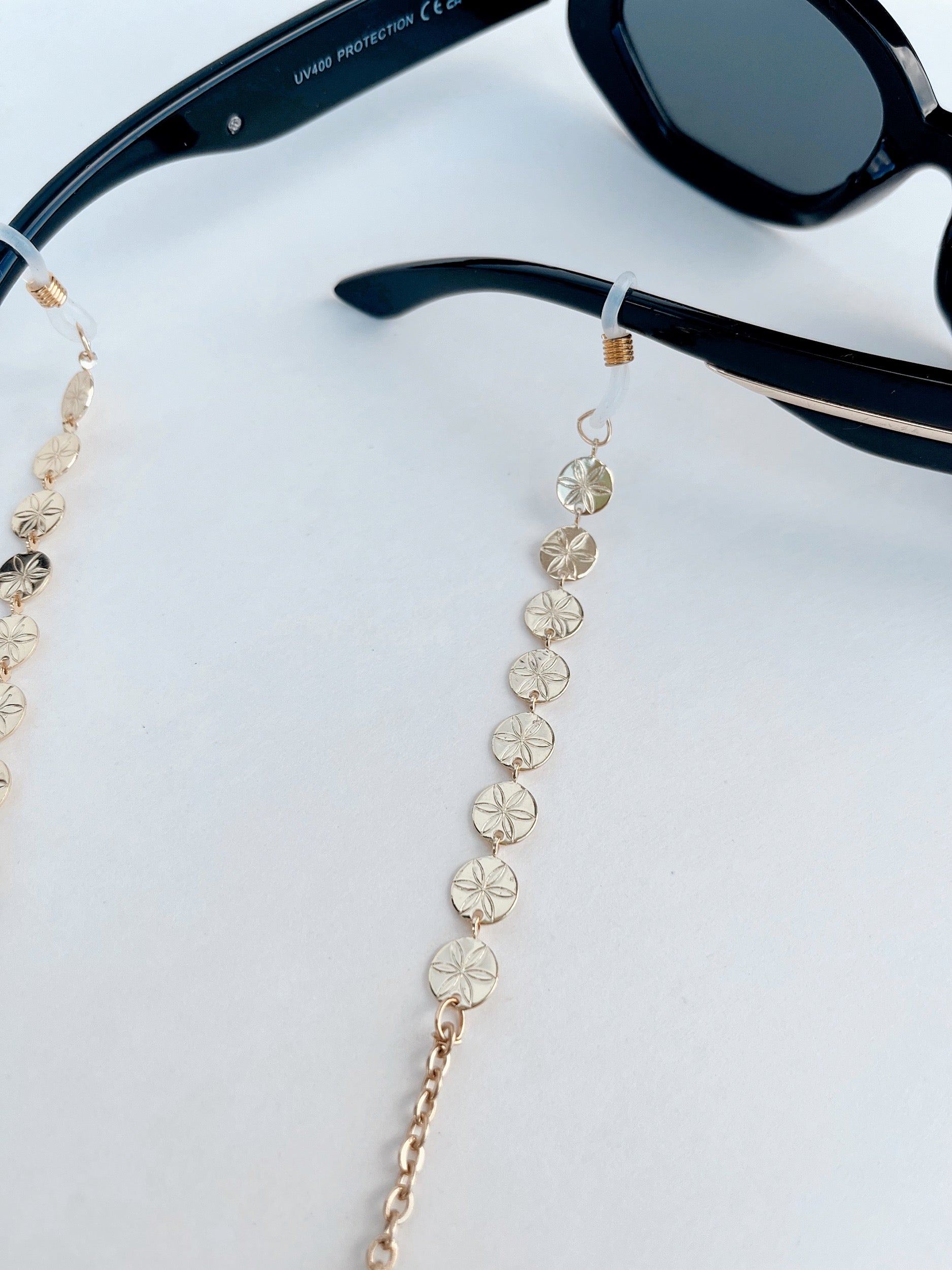 Cadena de lentes hecha a mano con diferentes abalorios y detalles en baño de oro.