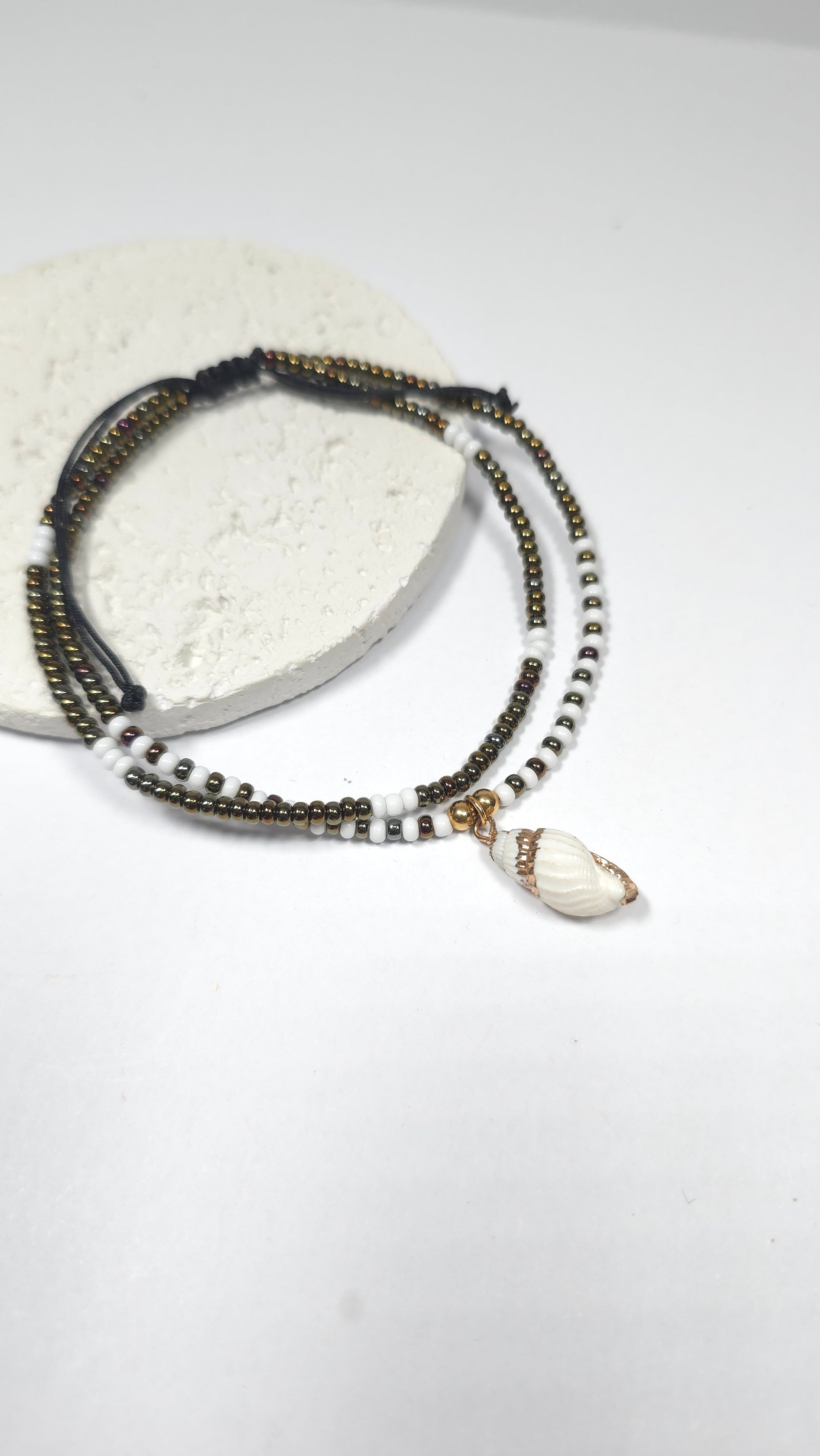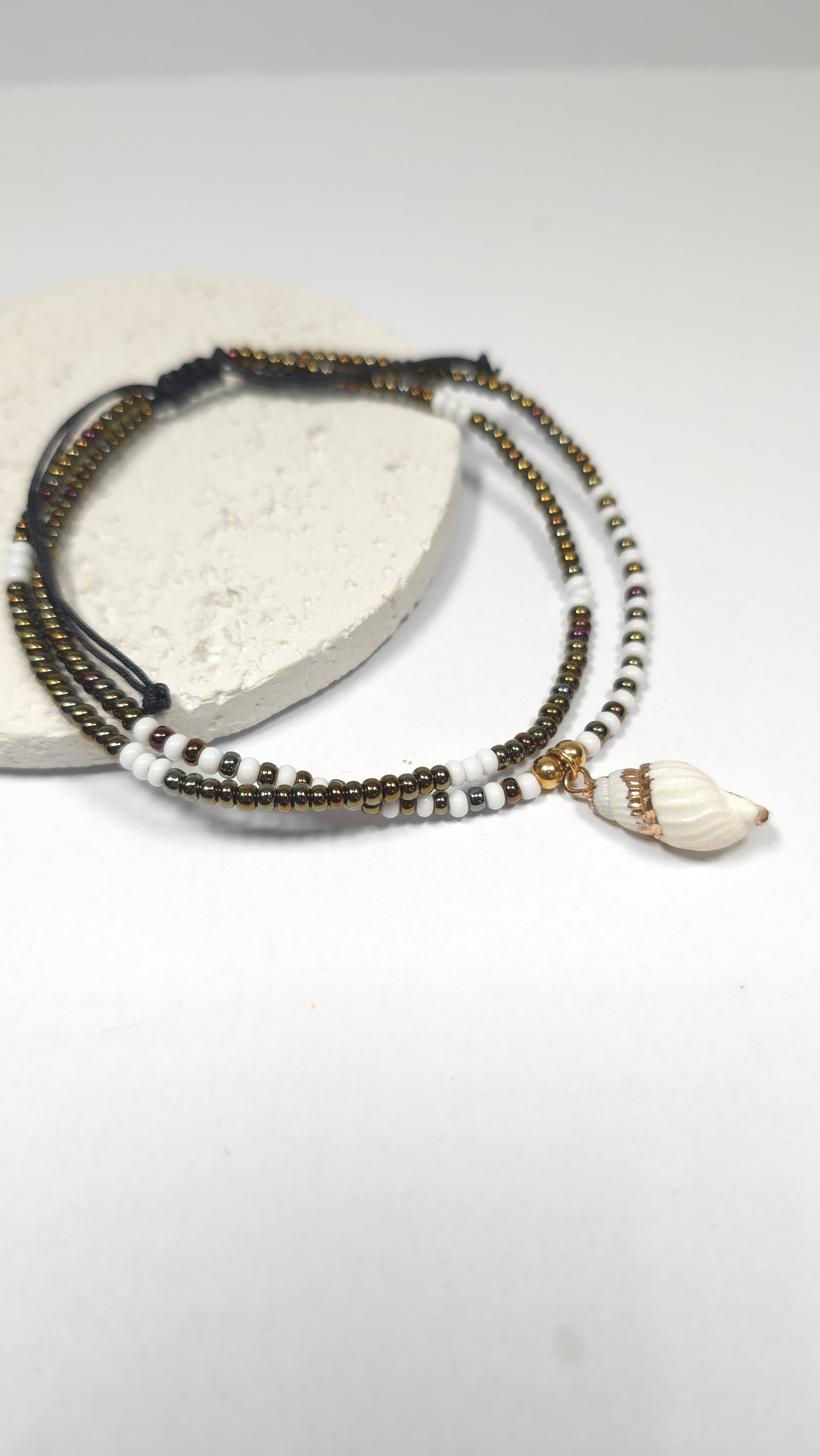 Dale a tu estilo un toque bohemio y playero con nuestra encantadora Tobillera "Brisa Marina". Diseñada con dos hilos de abalorios en elegante contraste (blanco perla y un sofisticado tono bronce u oro viejo), esta pieza es perfecta para cualquier ocasión soleada.