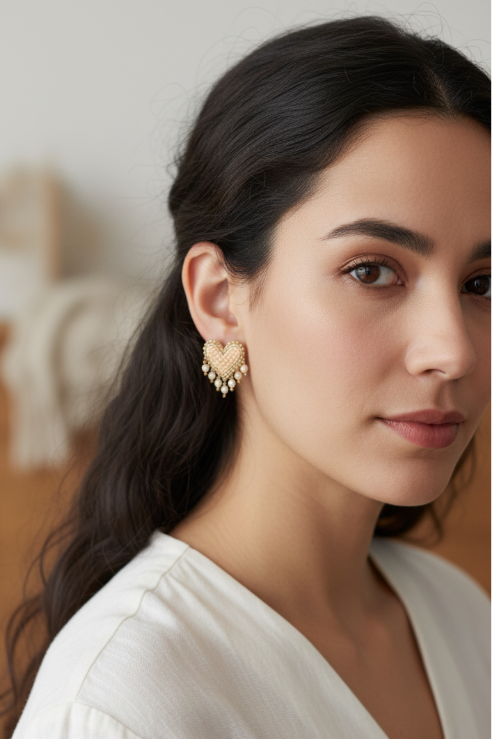 Estos aretes tejidos a mano combinan abalorios llenos de significado en forma de corazón y en un color romántico, con un acabado en baño de oro 18k, Cada pieza celebra la alegría, la energía y la esencia femenina que inspiran la colección VIDA desde el amor y el romanticismo.